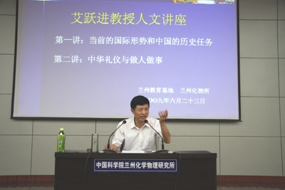 艾教授深入分析了国际背景与世界形势以及美伊战争的由来及影响,并结合当前的国际形势深入探讨了中国的国家安全、在国际舞台中的角色及今后应对世界形势的措施等系列问题,引起在场师生的共鸣,会场不时爆以热烈的掌声。艾教授表示,“爱国”不是口号,更不是激情,而是要扎扎实实地做好本职工作的实际行动。对于科研院所的莘莘学子,“爱国”就是要用科研成果报效祖国。他呼吁当代青年学子面对当前严峻的国际形势应当具有危机感、责任感和使命感,要增强民族精神,心系祖国,要肩负起中华民族复兴与强大的历史重任。艾教授从礼仪的内涵、本质要求、重要性、做人的层次等方面阐述了中华礼仪以及礼仪与做人做事之间的联系,讲授了当前社会中做人做事和生存、成功的技巧。艾教授对青年学子寄予厚望,他希望青年知识分子要做一个有素质、有文化、有格调的人。首先做一个好人,做一个成熟的大人,做一个成功的能人,争取做一个对国家、对人民做出卓越贡献的名人、伟人,为祖国的强盛做出中国知识分子应有的贡献。