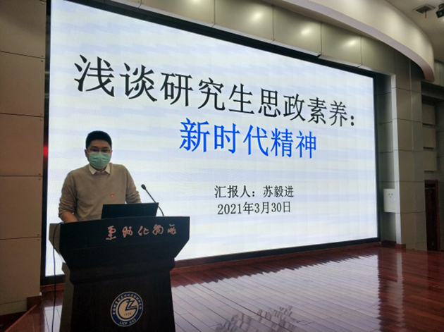 苏毅进研究员作了题为“浅谈研究生思政素养:新时代精神”的报告,介绍了科学家精神,分享了先进典型案例,号召全体研究生同学用习近平新时代中国特色社会主义思想武装头脑,增强“四个意识”,坚定“四个自信”,坚决做到“两个维护”,为祖国建设发展贡献自己最大的力量。