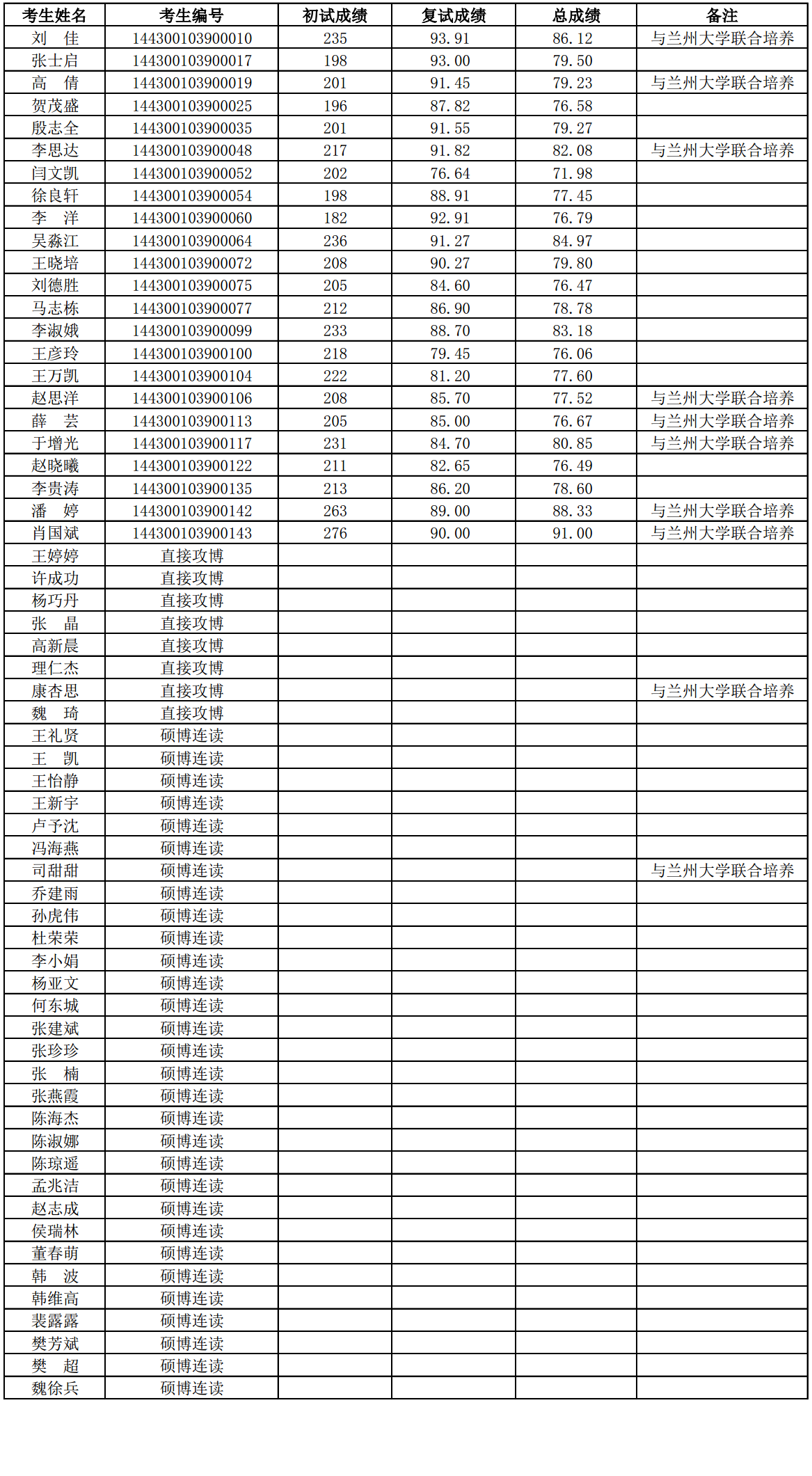 研究所拟录取2020级博士研究生共61名(含与兰州大学联合培养研究生10名),现将名单公示如下: