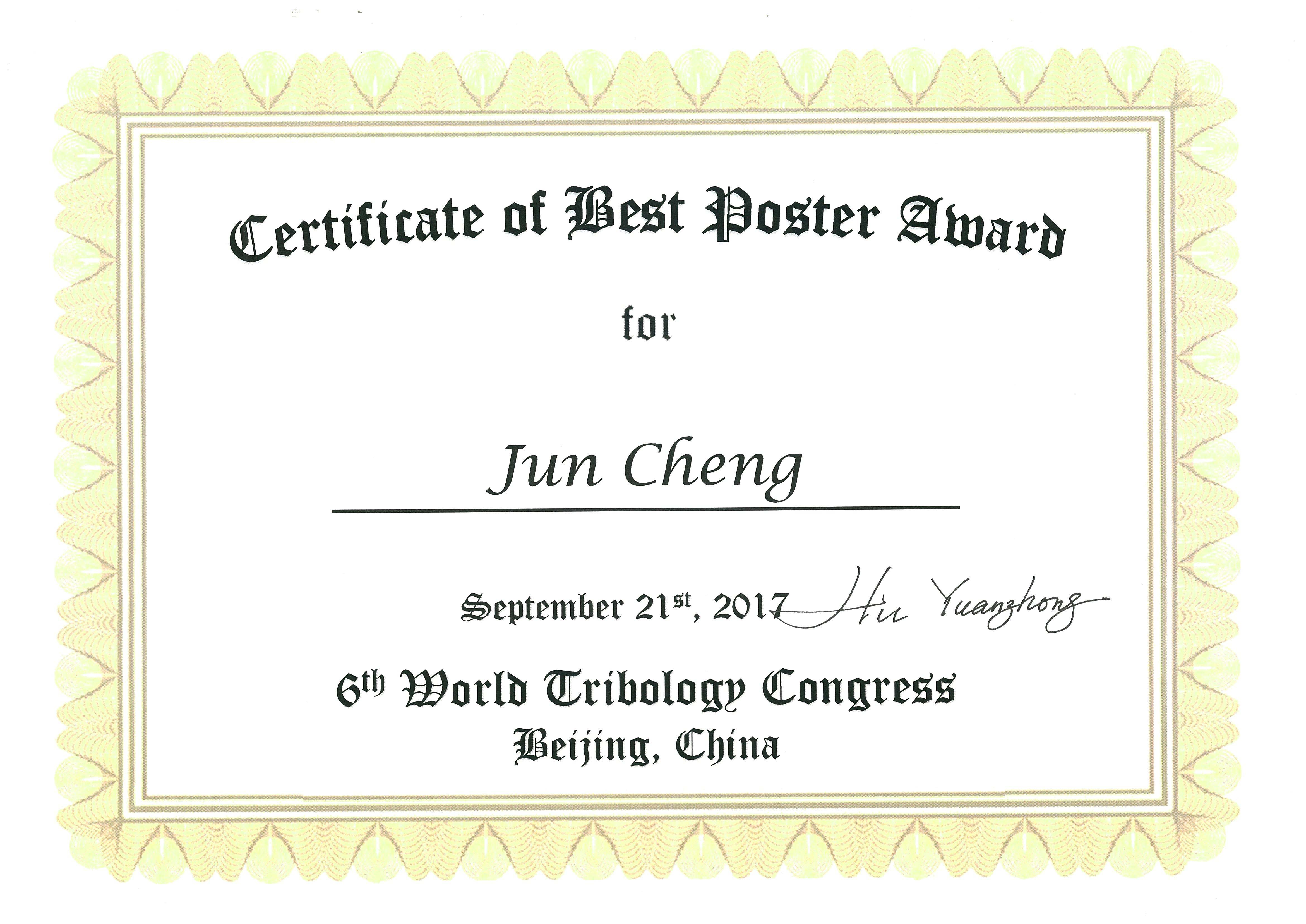 2017年9月17日至22日,第六届世界摩擦学大会(Sixth World Tribology Congress - WTC 2017)在北京国际会议中心召开。本课题组乔竹辉研究员和程军副研究员参与会议;会议期间,程军副研究员就“镍基固体润滑复合材料在高温真空环境下的摩擦学行为”的研究工作进行了墙报展示并与国内外专家进行了广泛深入交流,得到较好的评价并获得了会议“最佳墙报奖”(Best Poster Award)。