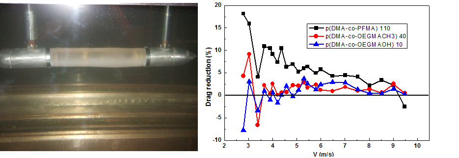 发展了含有多巴胺粘附基团的多种共聚物,通过改变共聚单体组成和含量实现共聚物在表面组装后固体表面能,减小固液界面分子之间相互作用,实现壁面摩擦降低,并通过西北工业大学高速水洞实验测试,证明组装共聚物表面具有良好的减阻行为。低速下~10%减阻率,高速下仍有3~4%减阻率(图1)。