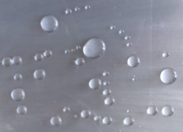课题组同时通过分子设计将低极性分子官能团引入树脂链中,降低涂膜后固体表面能,减小固液界面之间相互作用。喷涂后表面水接触角>110°,迟滞角小于5°,极易在表面脱离,此种低粘附表面会有很好的减阻效果(图2)。