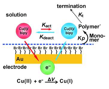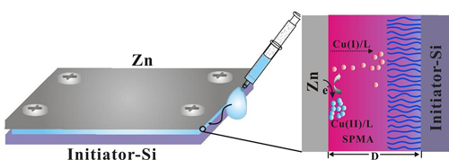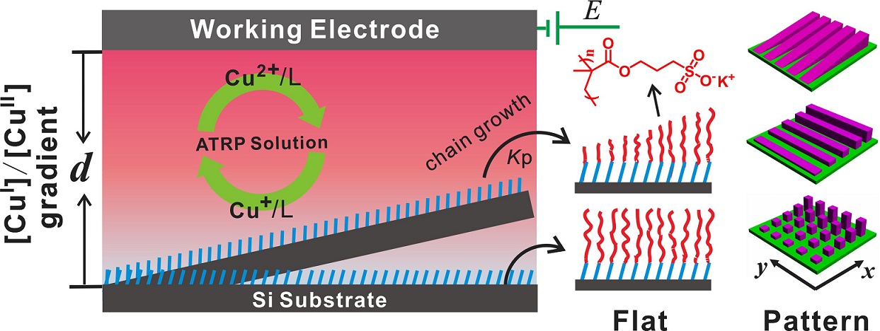 Electrochemical potential difference allows surface initiated ATRP occurring in a metal-substrate sandwiched architecture in air using volumes as small as 10 µL, in which CuI activators are continuously generated and diffused to initiator modified substrate, while the presence of CuII deactivators benefit to keep polymerization living for even longer time. Polymer brushes gradients plus complex shapes can be easily obtained due to spatially distribution of catalysts. The unique advantage of the novel approach is to carry out polymerizations of multiple monomers on a single surface very easily and theoretically, many polymer brushes can be formed easily if more template wells/channels are prepared and monomer solutions can be delivered in each.6 References -
