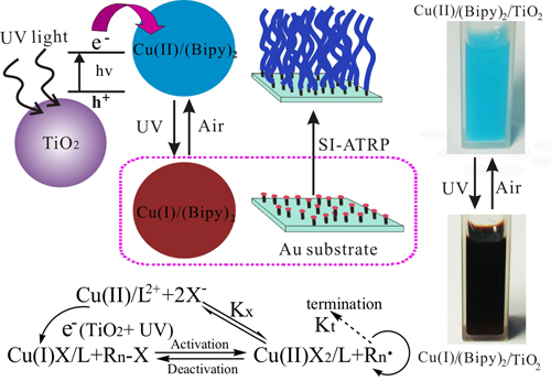 UV light-induced surface-initiated atom-transfer radical polymerization (UV-ATRP) uses TiO2 nanoparticles as photoactive materials to reduce Cu(II)/L to a Cu(I)/L complex under UV irradiation by a one-electron transfer process for ATRP with multiple usage of monomer solutions. The growth of polymer brushes can be manipulated by either varying the content of photoactive materials or regulating the irradiation intensity, thereby yielding polymer brushes with controllable thickness, composition, and architecture.5 d. sa-ATRP (Sacrificial-Anode Atom-Transfer Radical Polymerization)