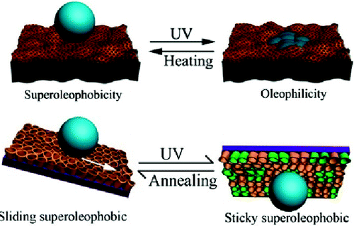 11. Engineering a Titanium Surface with Controllable Oleophobicity and Switchable Oil Adhesion, Daoai Wang, Xiaolong Wang, Xinjie Liu, Feng Zhou*, J. Phys. Chem. C, 2010, 114, 9938-9944.