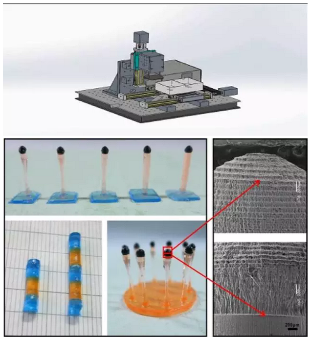 图2. 双(多)材料3D打印示意图(上)及成型件照片和电子显微镜图(下)。其中,蓝色为硬材料,黄色为软材料,黑色为磁性材料。