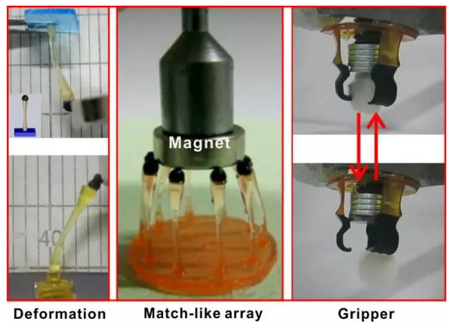 研究表明,这个驱动器的磁性和非磁性两种树脂之间具有很好的结合力,能够在磁场作用下进行有效的磁性驱动,从而实现弯曲、变形与运送货物等功能。