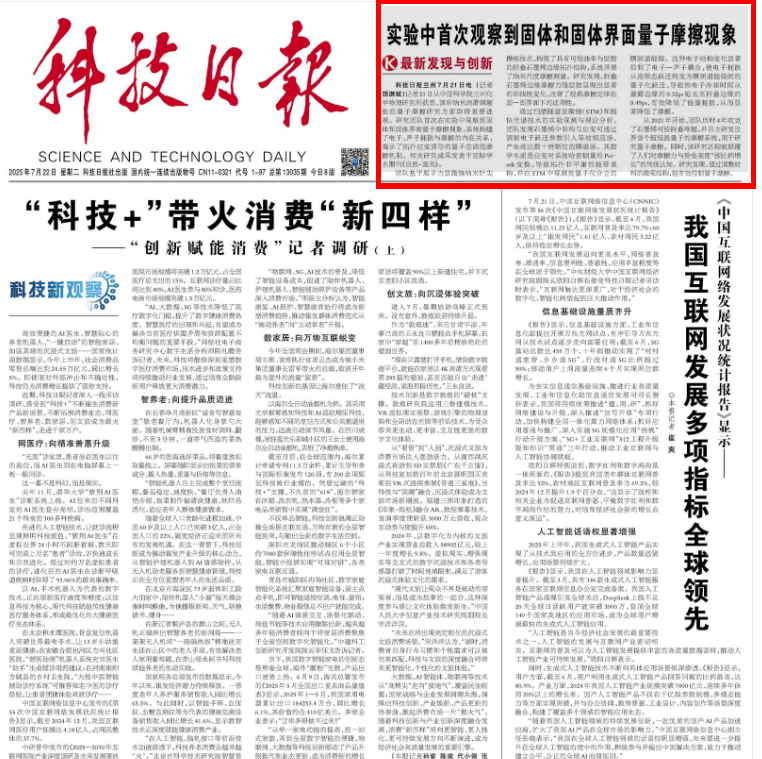科技日报兰州7月21日电 (记者颉满斌)记者21日从中国科学院兰州化学物理研究所获悉,该所纳米润滑课题组在量子摩擦研究方面取得重要进展。研究团队首次在实验中观察到固体和固体界面量子摩擦现象,系统构建了电子、声子耗散与摩擦的内在关系,揭示了拓扑应变诱导的量子态调控摩擦机制。相关研究成果发表于国际学术期刊《自然·通讯》。