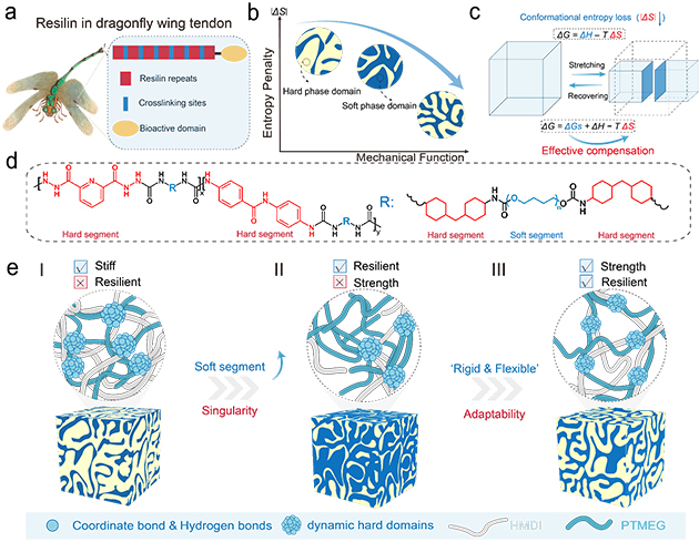 图1. 受蜻蜓角质层中弹性蛋白启发的低熵罚聚氨酯弹性体设计制备示意图