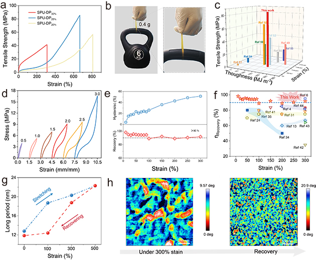 最后,研究人员通过机械性能测试证明,利用动态硬域精准控制微相分离,成功实现了聚氨酯弹性体在力学性能上的调控,突破了长期以来高强度和高弹性无法兼容的瓶颈。调控优化后的聚氨酯弹性体断裂强度超过80MPa以上,该拉伸强度超过了目前已报道的大多数人工合成弹性体。此外,该优化的聚氨酯弹性体在短程应变下表现出超过90%的回弹效率,且在长程应变下超过88%,该回弹效率也超过了目前所报道的大多人工合成弹性体,在短程变形时甚至可与生物弹性蛋白相媲美。
